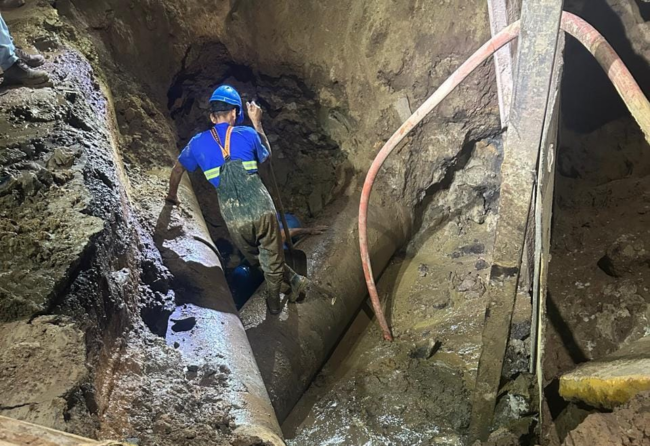 Paralelamente, tiveram início os trabalhos diretos de manutenção da adutora rompida. Para isso, foi preciso esvaziar completamente o trecho afetado, um processo demorado e de alto risco técnico, uma vez que o local apresentava uma grande cratera aberta. Foi necessário escoramento da área para evitar desmoronamentos e a utilização cuidadosa de maquinário pesado, garantindo que a estrutura da adutora não sofresse novas avarias durante o conserto.