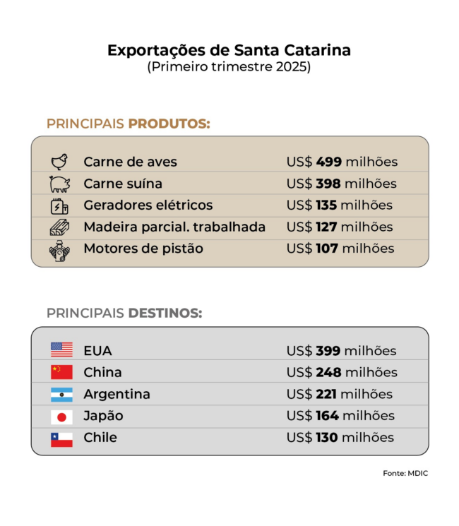 “A economia de Santa Catarina é muito diversificada, o que garante abertura a diversos mercados. No primeiro trimestre, o estado exportou para quase 200 destinos pelo mundo. Isso demonstra a força e competitividade da nossa produção”, acrescenta o secretário Silvio Dreveck.