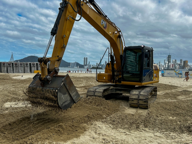 O peneiramento da areia da Praia Central, no trecho impactado pelas obras de macrodrenagem, segue em andamento em Balneário Camboriú. A ação, iniciada na segunda-feira (24) com a etapa manual, avançou para uma nova fase na tarde de quinta-feira (27), quando a máquina equipada com concha peneirada passou a atuar no local.