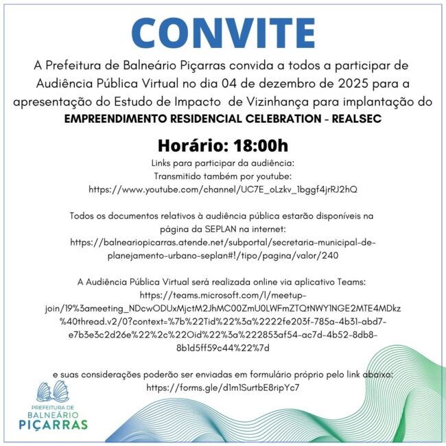 A Prefeitura de Balneário Piçarras CONVIDA a população do Município, para participar da